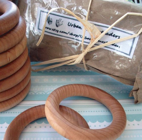 , Thes simple 3" wooden teething rings have been sanded smooth and finished with our own, organic beeswax and olive oil polish. The nice, 3" size of the rings let them grow with your child. The simple rings a perfect teether and early infant toy. Attach a cord, and it becomes a nursing necklace. As your baby becomes a toddler, you can tie silk sashes, and use these simple, beautiful toys are twirling/dancing rings!