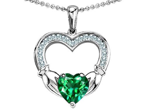 Star K 305182, 925 Sterling Silver hands holding heart celtic love 1inch claddagh pendant with simulated emerald crafted in 925 Sterling Silver Dimensions: Width: 18.00 mm Length: 23.00 mm. 1 Stone 2.00 Carats Heart Shape 8 mm Color: Green Clarity: Clean, 15 Stones 0.50 Carats Cubic Zirconia Color: Colorless Clarity: Clean Free 18 inches chain included . Finejewelers Style Number: 305182.